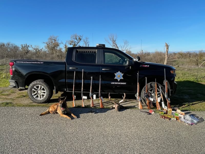 CDFW wildlife officers concluded a poaching investigation that led to multiple arrests and the seizure of several firearms in eastern Fresno County. Officers had received a tip about a discarded buck deer carcass found long after the close of deer season. The carcass had been left to waste with its head removed.