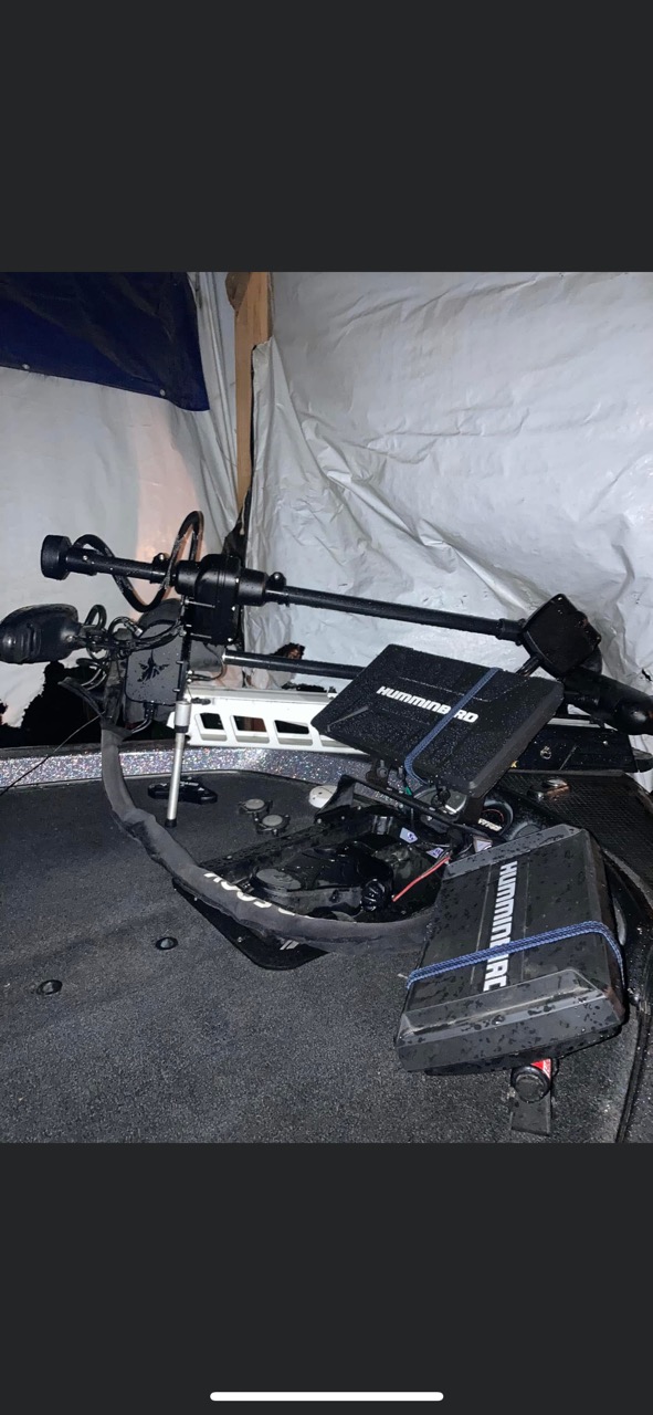 Boat has 2 hummingbird graphs in front solix 15 and a helix gen3 12inch also has hummingbird mega live 80 pound thrust trolling motor and on the dash a 10 inch Hummingbird graph . Two 10ft power poles (1) agm battery and (2) lithium batteries three bank battery charger