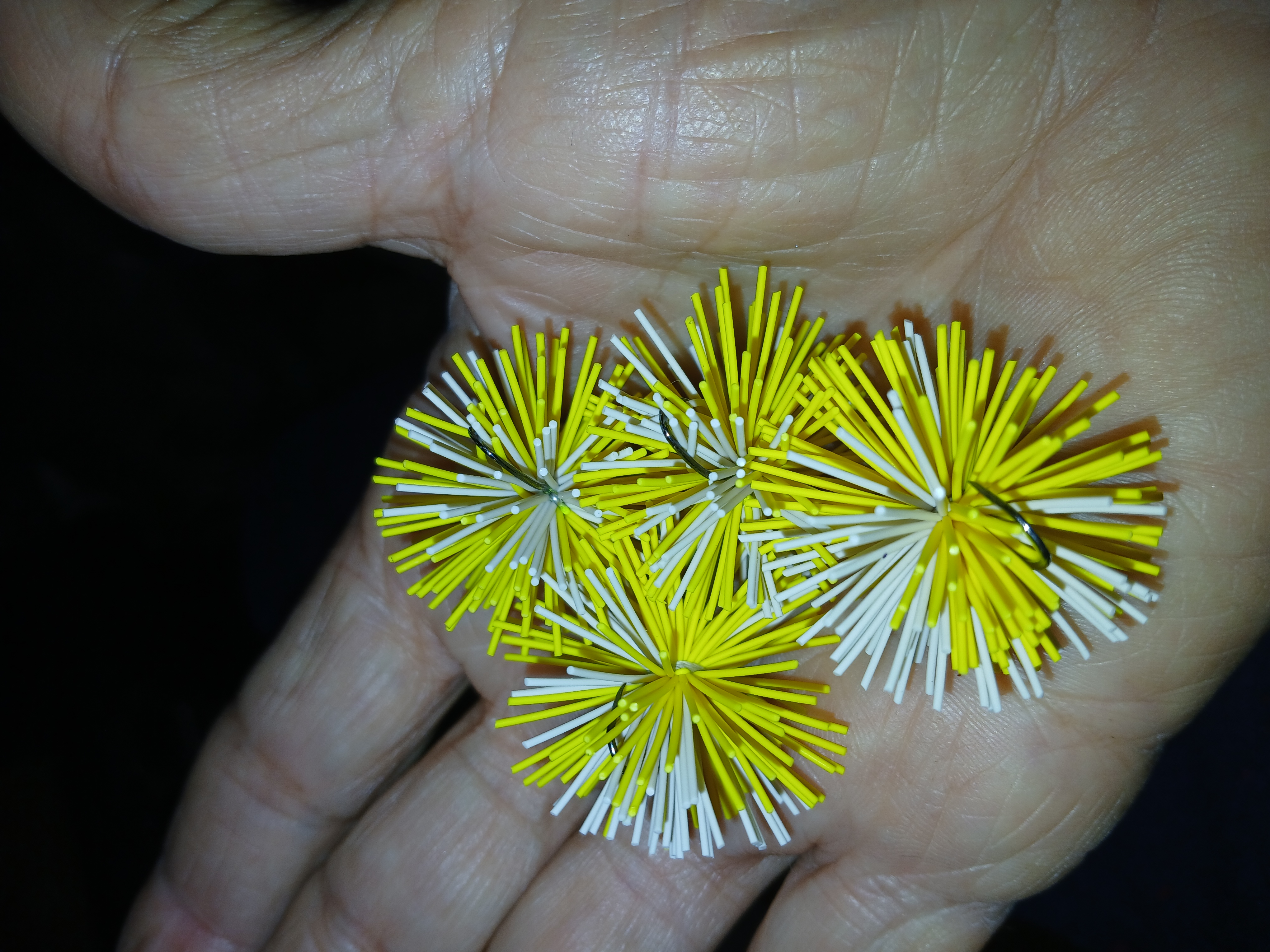 And 6'6" MH spinning outfits you will have more fun than you can imagine. During the spawn Spots and LMB will eat them from March thru July.The Smallmouth will eat them also. Feb thru May are best for the Smallies. You can make them with Round rubber reg grade or fine grade. Round rubber with silicone accent or you can use Flashabou and bucktail accents.