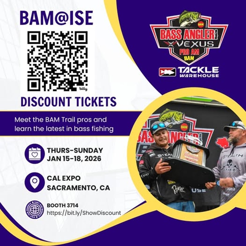 BAM is heading to the ISE Show at Cal Expo in Sacramento, January 15–18. Stop by the BAM booth and meet some of our top pros throughout each day. It’s a great chance to talk fishing, pick up a few new tips and tricks, and see what’s coming for the 2026 season.
