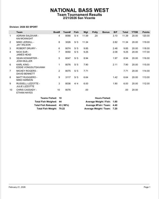 Congratulations to Craig Big Country Adolphi and William Thomas for taking the win in the Team Pro Division of the National Bass West San Diego region at San Vicente Reservoir. Congratulations to Adrian Saldivar and Kai McNight taking the win in the Team Sportsman Division.