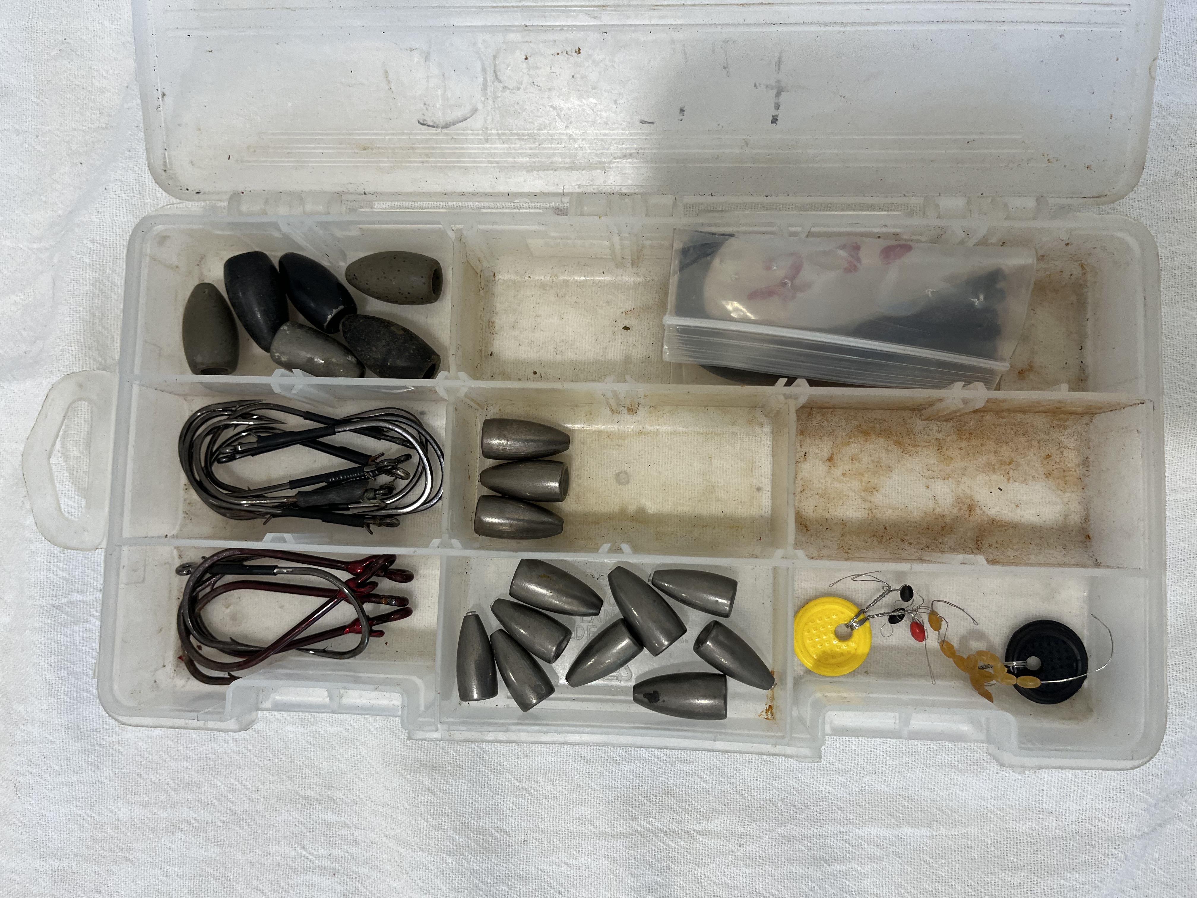 -misc terminal tackle box has all different kinds of hooks for drop shot with tungsten and lead weights, swim baits hooks, worm, wacky, center lock springs etc