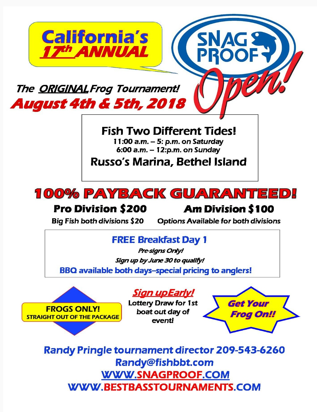 It's getting closer!! The Original Frog Tournament on the California Delta the Snag Proof Lures Open. Sign ups are open for this 100% Payback Open Team Tournament. Go to http://www.fishbbt.com