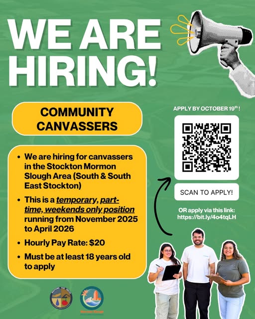 Restore the Delta’s Mormon Slough Restoration Association is looking for passionate community members to help canvas and advocate for Stockton, CA’s Mormon Slough! We’re looking for community members to join our canvassing team to help share information about the project, distribute surveys, and connect with residents in the area.