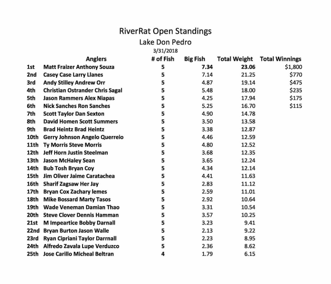 Alright guys Here is the results for yesterday. We Had a total of 32 boats. Congratulations To Matt Fraizer and Anthony Souza on their big win. Also look at the payout it is one of the best in the California. We are on to Eastman. This tournament will take some Major weight to win.