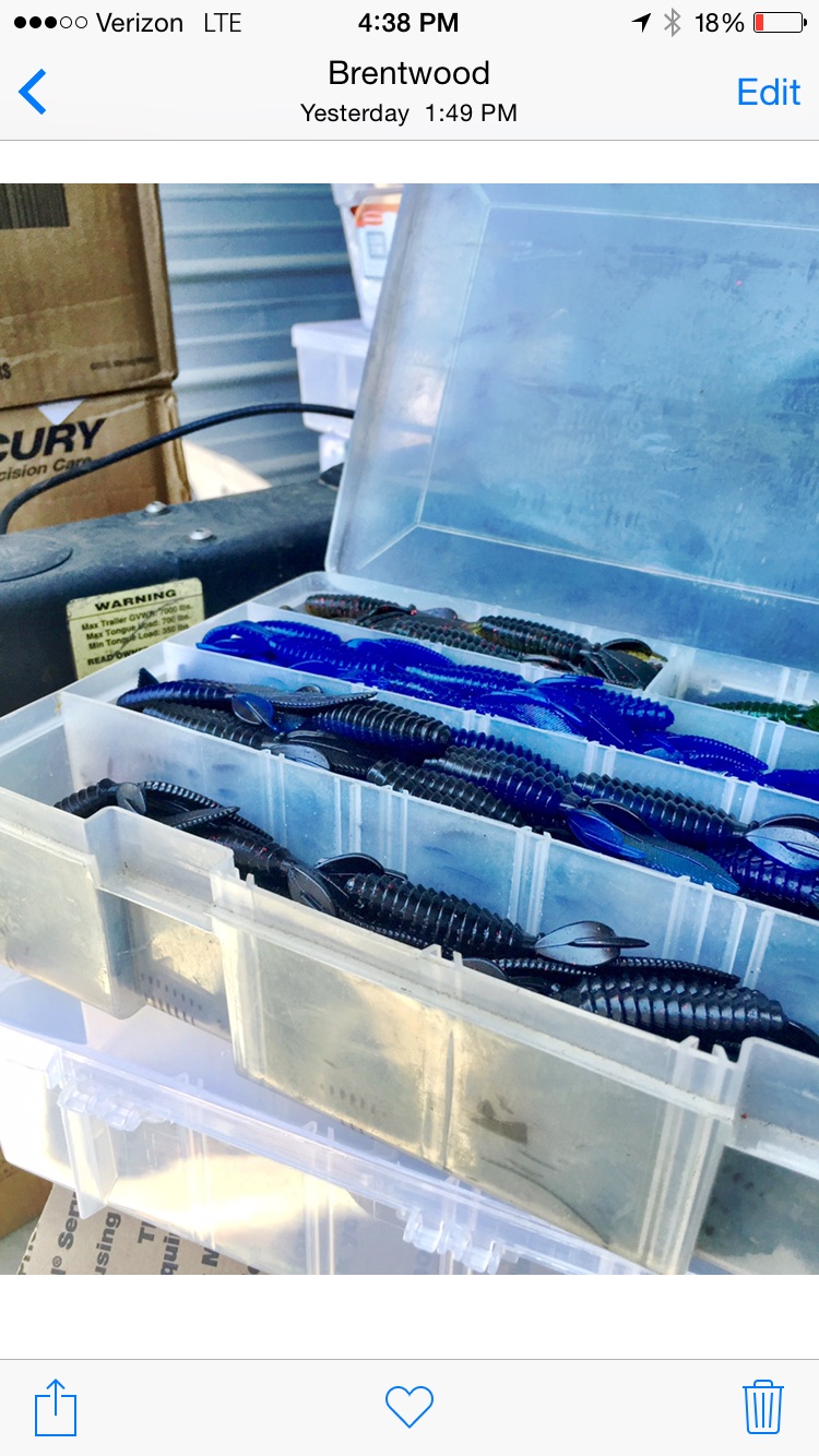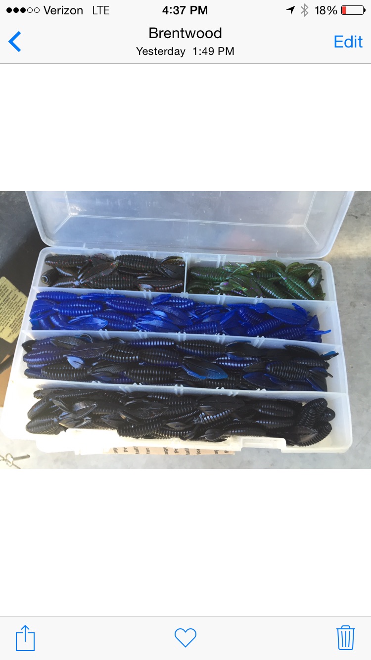 I have a Plano 3730 box full of 4.2 size sweet beavers. Colors are black red flake, back water blue (good jig trailer), penetration, CA 420 and sprayed grass.