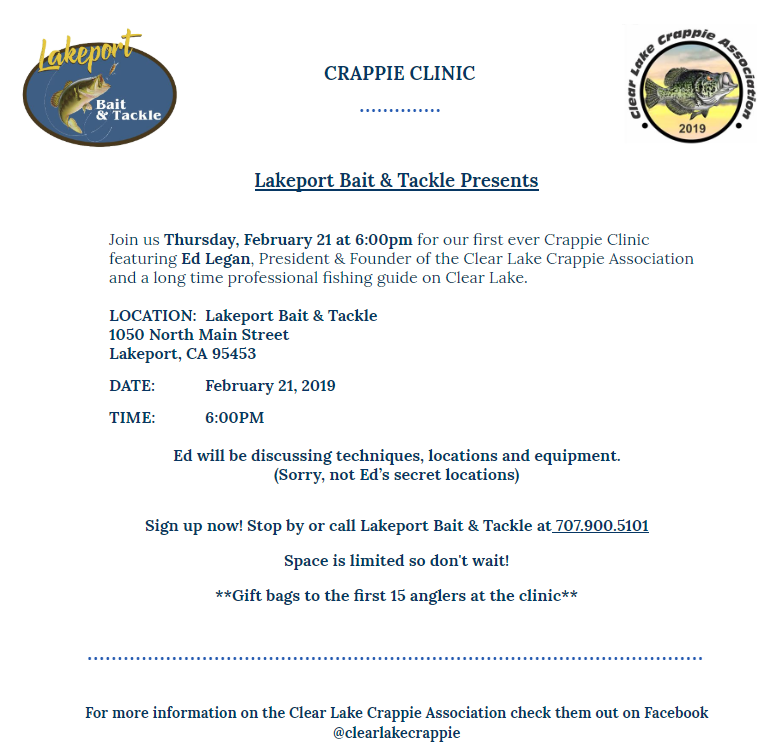 Just in time for the Clear Lake Crappie Associations second competition of the season. Lakeport Bait & Tackle is hosting our first crappie fishing clinic. Ed will be discussing techniques, equipment and how to locate fish. Don't miss out on this valuable information from one of Clear Lakes veteran fishing guides.