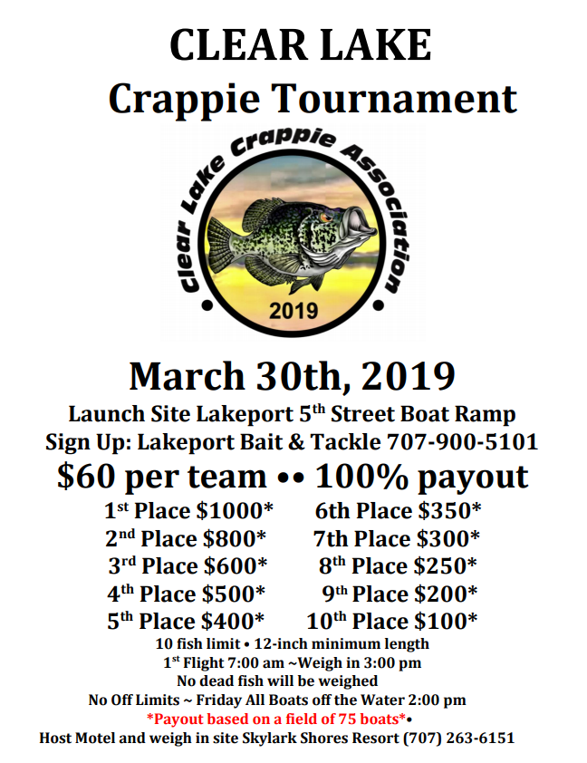 100% PAYOUT, FOOD & PRIZES!! Clear Lake Crappie Tournament March 30. 2019