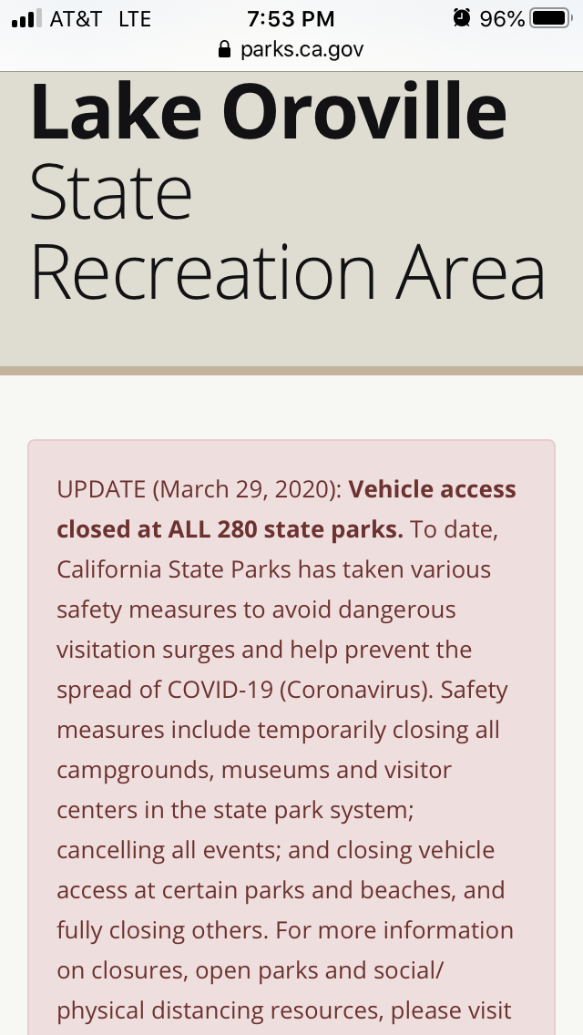 Unless you live by that certain body of water and go look for yourself it hard to be sure with out a reasonable doubt. A lot of gray area whereas the park itself might be closed like that notice said but the boat ramp(s) is still open. Earliest I can look at oroville is tues or Wed.