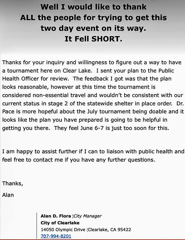 I could be wrong here but it doesn't seem like there are organizations that are putting tournaments on at Clear Lake before June 6? And it hardly seems like BBT has control of the County allowing them to come or not. The Delta is one thing, even when certain ramps were closed there were still many that weren't. Is there really any place besides the Delta in California that anyone has been able to put a tournament of that size on yet? Unfortunate that even with posting the letter showing that BBT was tying to get it done and were declined, and they still get the blame. Looking at the size of the Wed nighters, I would say there are plenty of poeple that want to fish whatever they can, even in 106 degrees.