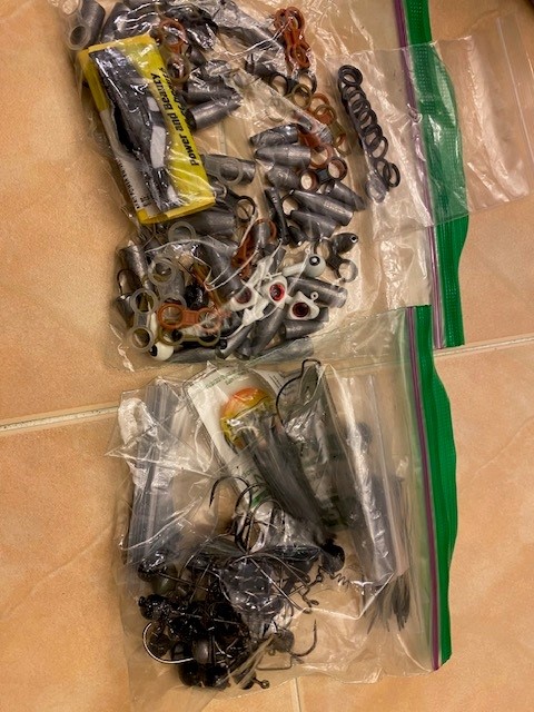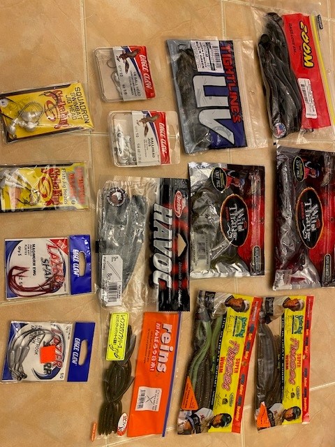 I have a mix of plastics, swimbaits, hooks, jig heads, bait cover, mix of weights, orings, stops, hooks for sale. Selling only as a lot not breaking up. Most are unused.