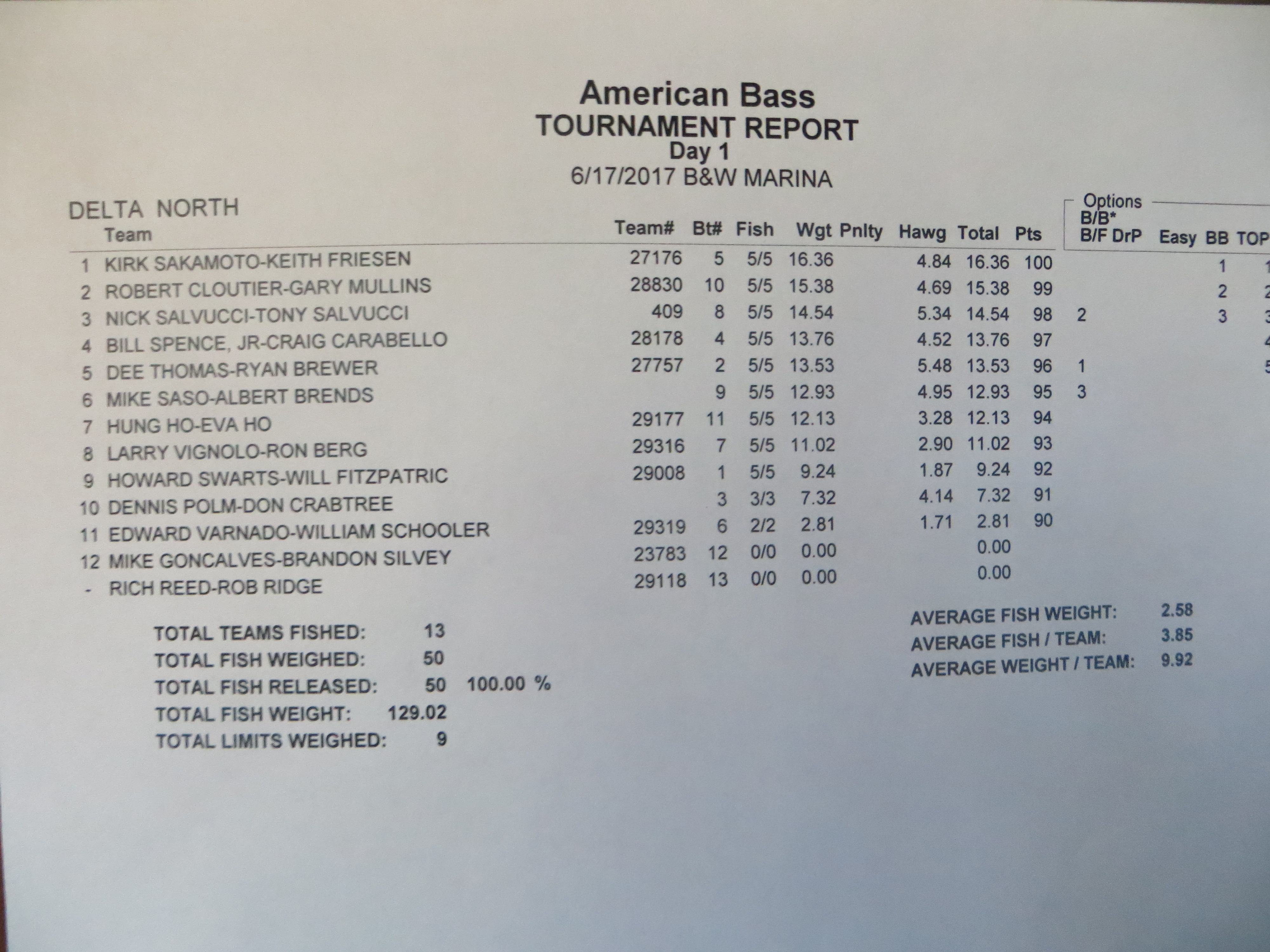 Thank you to all the teams that braved the 100 degree heat today. This was our fourth tournament for this region. Congrats to Dee Thomas for winning BIG FISH weighing in at 5.48 lbs. Congrats to Kirk Sakamoto and Keith Friesen for winning 1st place weighing in at 16.36 lbs.