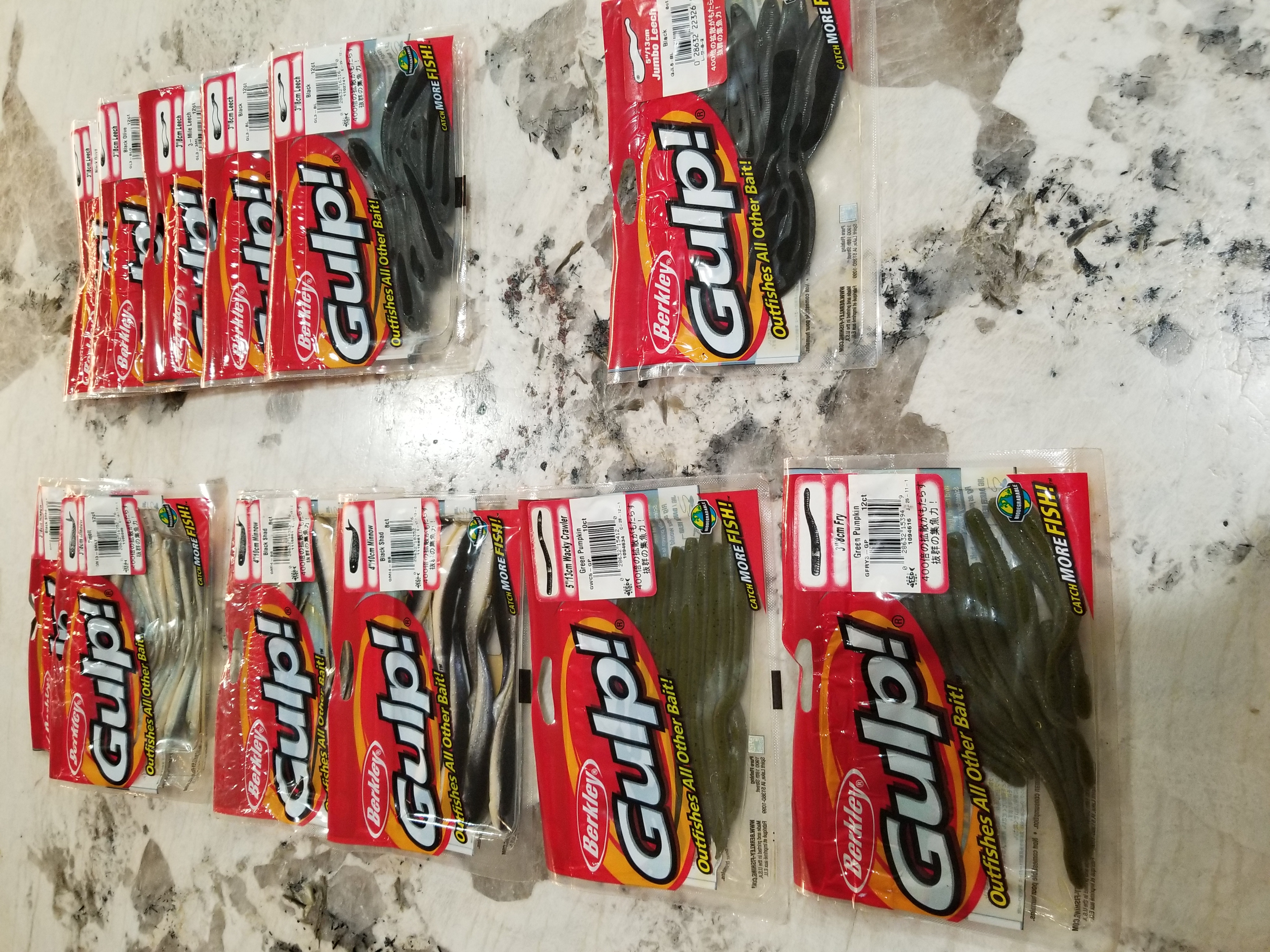 Lot 11: Berkley Gulp Lot (12 packs). 3” minnow, 4” minnow, 3” leech, 5” leech, 3” fry. Black olive, black, 3-mile, green pumpkin, black shad, smelt. $30 OBO.