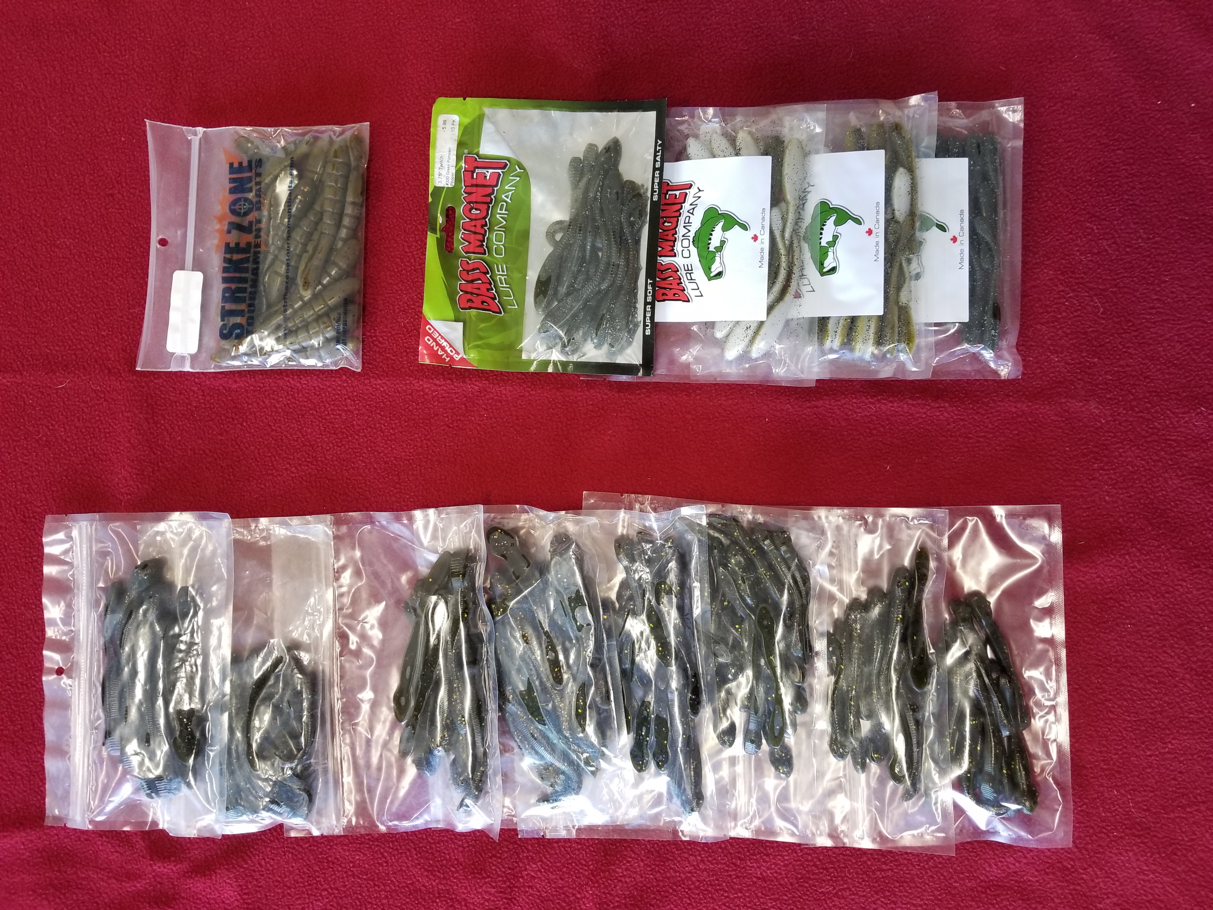 Lot 18: 3” and 4” custom hand poured gobys, 3 and 3.75” bass magnet twitches (13 packs). Green pumpkin with gold and purple flake, green pumpkin, green pumpkin pearl. $35 OBO.