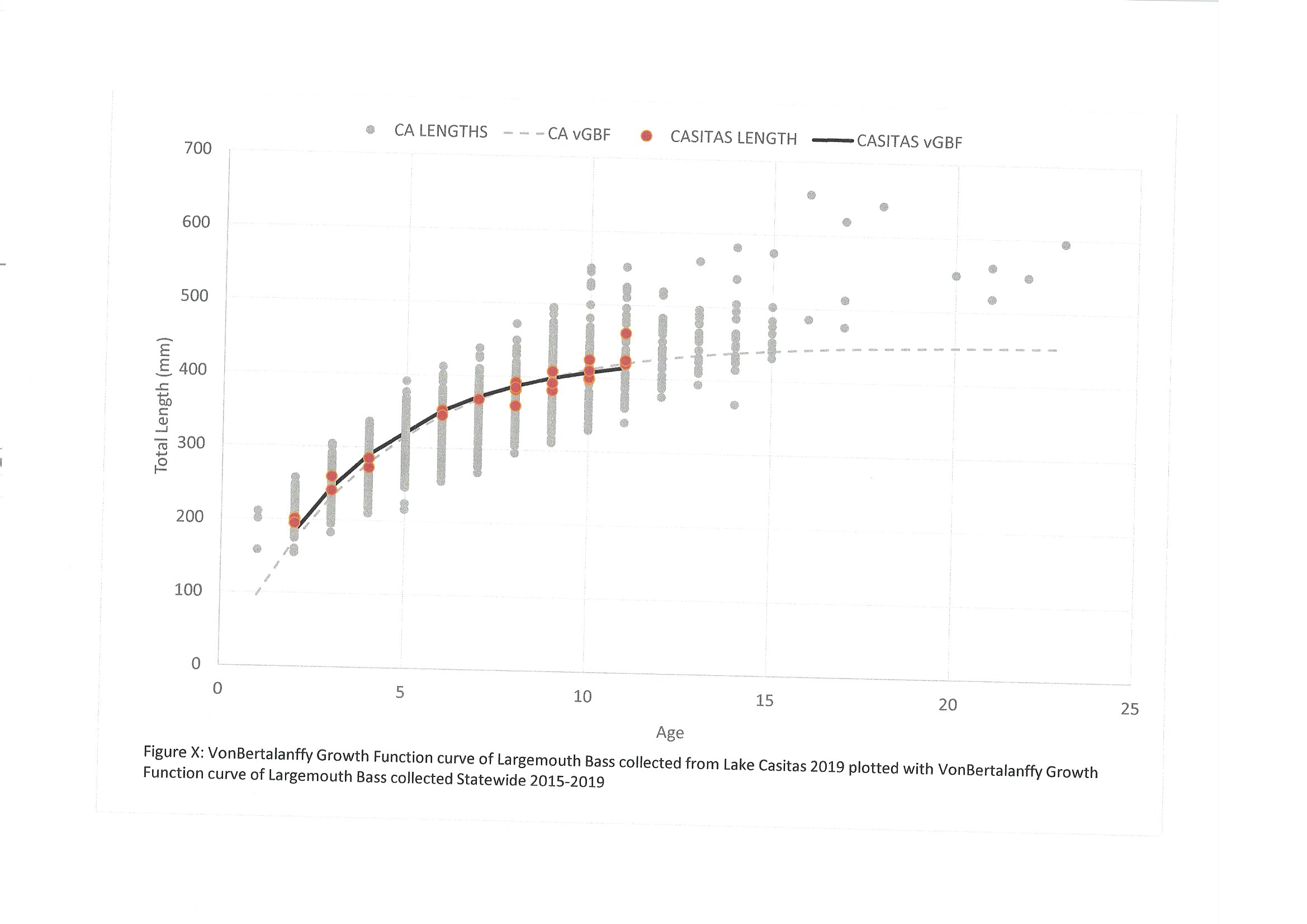 Growth rate of LMB at Casitas is middle of the road average when compared to LMB sampled throughout the State....which is horrible relative to what it used to be Statewide. The graph below illustrates the Von Bertalanffy Growth Curve for Casitas plotted against the vBGF of LMB collected Statewide from age/length data collected for Mercury consumption recommendations. You will notice the L inf isn't even 18". Though the sample size is <30 fish from Casitas it's pretty telling. Given all of the ecological variables that occurred and continue to occur the biggest change from "the good ole' days" is the "C&R everything" mentality.