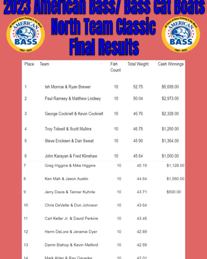 ABA provided an awesome tournament regardless of how many showed up. AND after the 2 days TOC, ABA provided another tournament at no extra cost to fish for a boat on a different lake. That was the BassCat Shootout at Lake Sonoma. This was an additioanl separate tournament on top of the TOC that TOC top finishers and AOYs were invited to. A real invitational where you qualify by your finish and you don't pay anything extra to compete. And if we wanted to go to Arizona or PNW, ABA provides 3 TOCs and 3 BassCat shootouts for their anglers to fish, regardless of what area they qualify from.