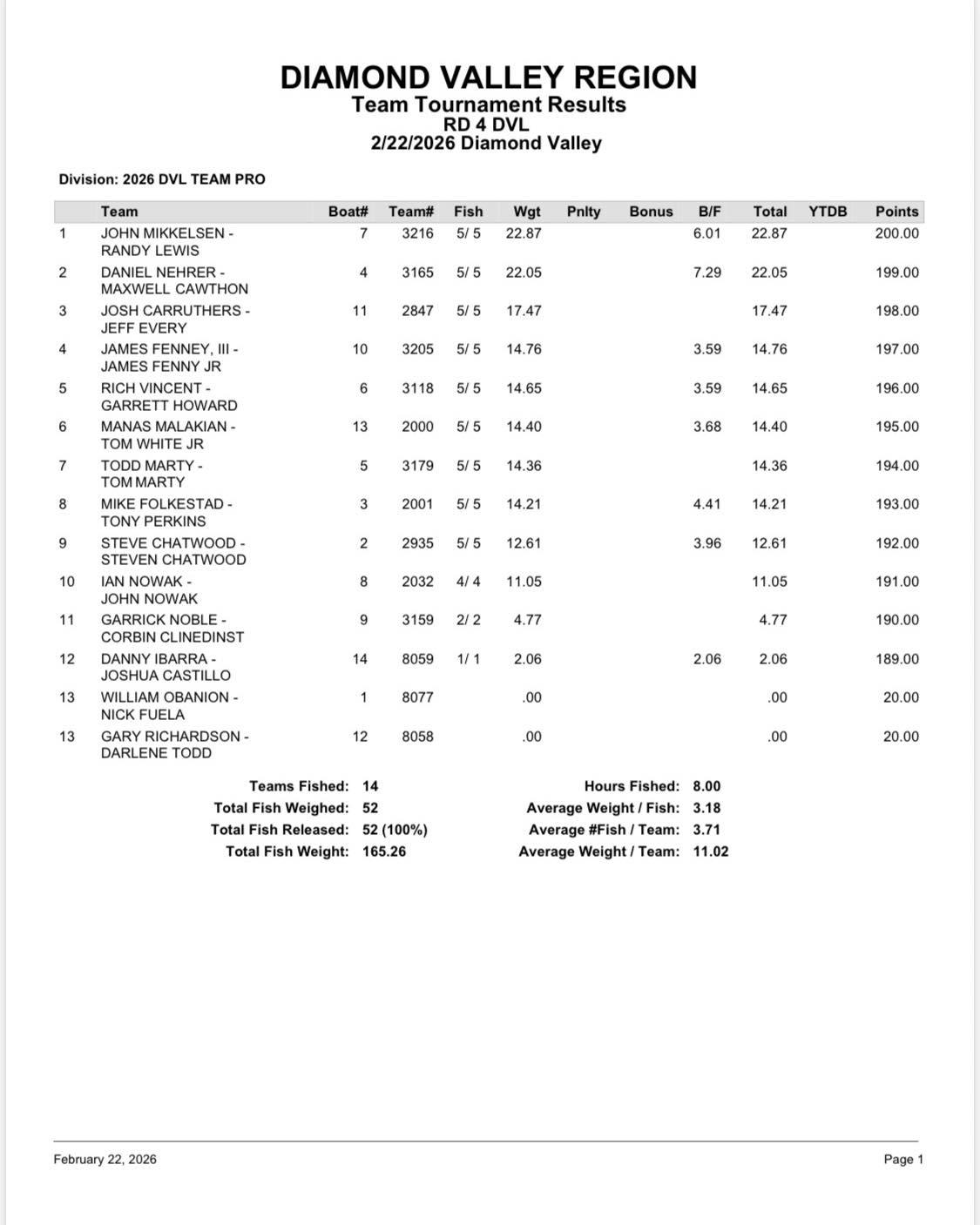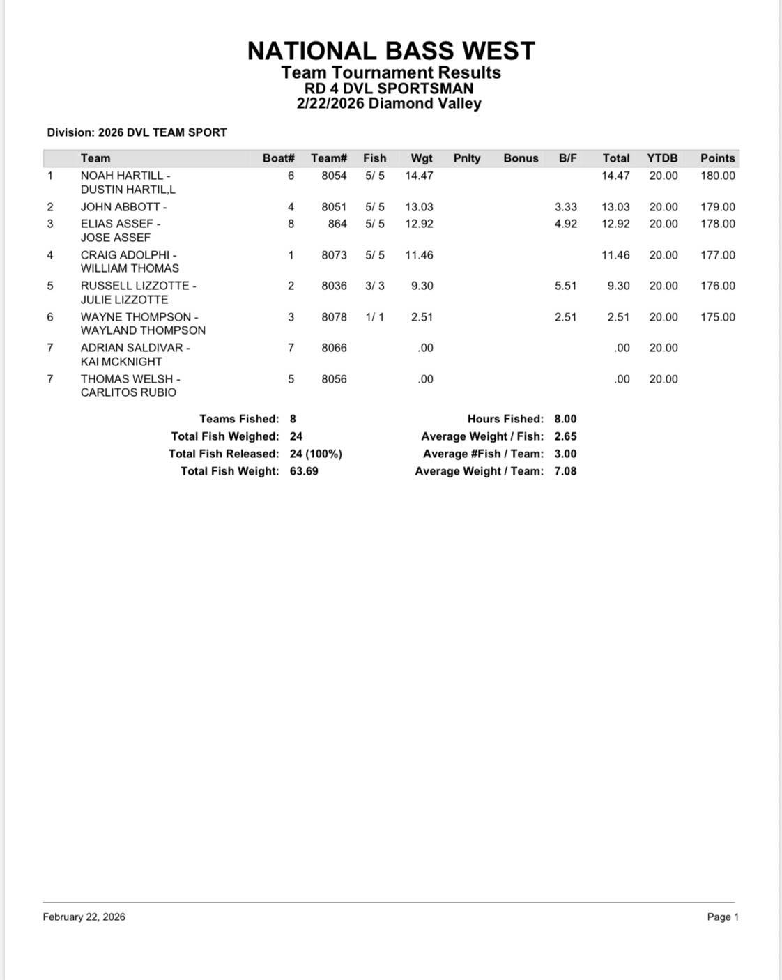 Congratulations to John Mikkelsen and Randy Lewis taking the win in the Team Pro division at round 4 of the National Bass West bass fishing team trail at diamondvalleymarina! Congratulations to Noah and Dustin Hartill taking the win in the Team Sportsman division
