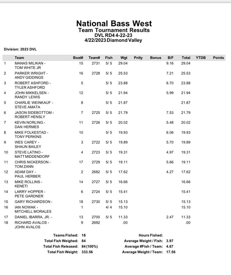 WOW! 29.04lbs to win! 7 teams with over a 20lb bag, 11 teams over 19lbs! Our Last Chance award for last place took a limit for 11.33. Diamond Valley can really be amazing! Make sure you are at the next tournament on 5/20/23 for your chance to win some big dollars and great fishing!