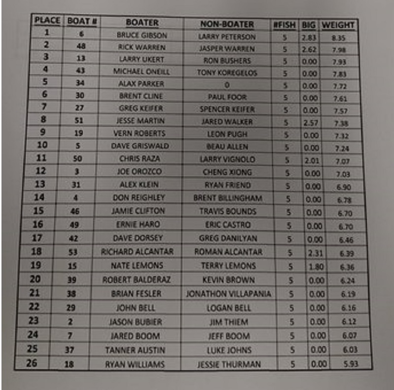 Here are the final results from our 2nd annual North Valley Tackle Open. We had a great turnout of 56 boats! A huge thanks goes to everyone that helped with this event and who fished it!