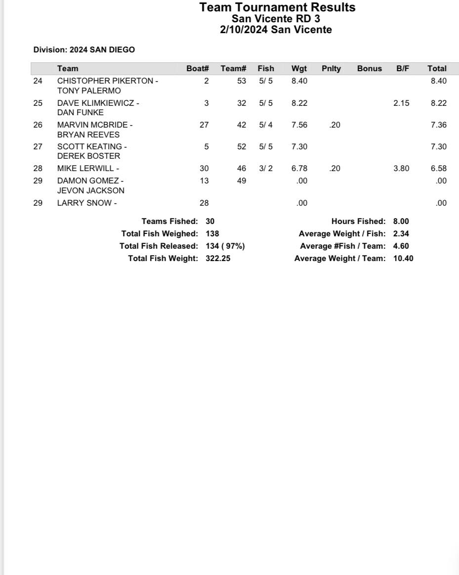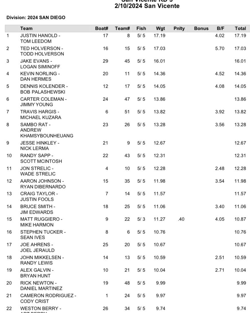 Congratulations to Justin Hanold and Tom Leedom taking top honors for round 3 of the National Bass West San Diego region!