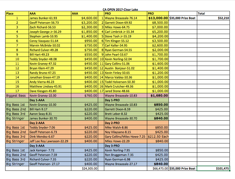 Congratulations again to the only consecutive 2 time WON BASS California Open Champ Wayne Breazeale and AAA Champion James Bunker. It was an awesome event, and we can't wait till next year. We are working on the dates for 2018 currently. Below are the basic payouts for the event.