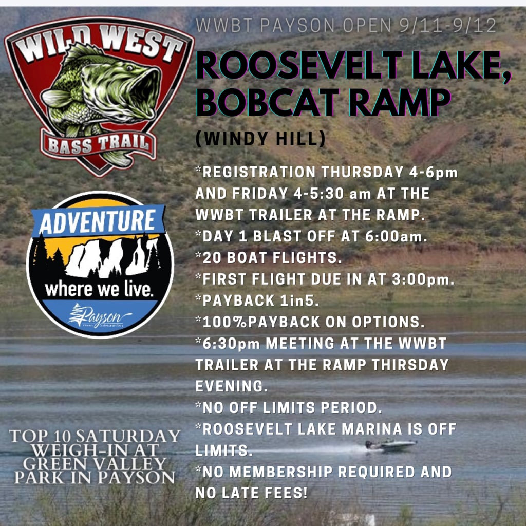 We look forward to seeing you at the Town of Payson Open this weekend at Roosevelt lake. The WWBT trailer will be at the Bobcat boat ramp area Thursday for registration and the 6:30pm meeting. See you there!