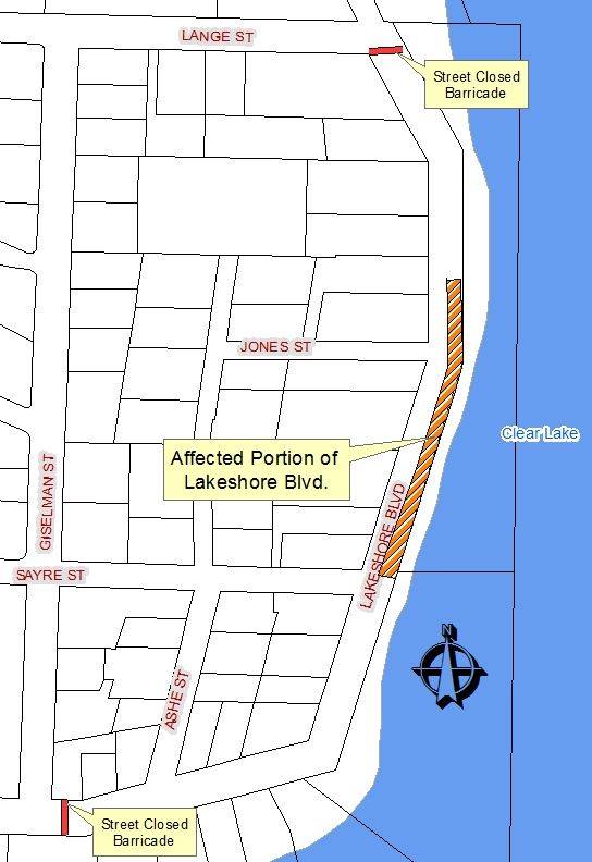 Over the weekend we received further information on the area of Lakeshore Blvd from Sayre Street extending about 100 feet north of Jones Street. This had been reported in previous releases as in danger of possible collapse. That condition continues and we suspect hollow areas under the pavement. Persons driving, walking, riding bicycles or doing anything else in this area could fall through the pavement and be injured or killed. Our Public Works Department has added more barricades and signs to keep people out.