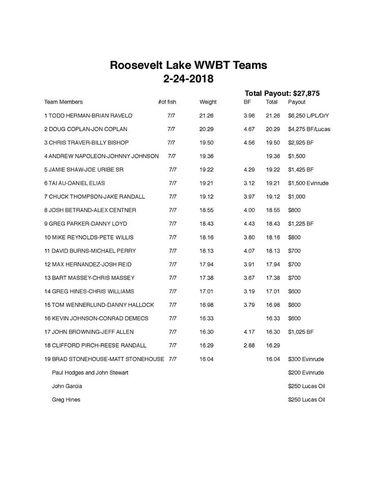 Congratulations to All WWBT Lake Roosevelt team cash winning anglers. A special thanks to all of our sponsors. Lucas Oil Gary Yamamoto Custom Baits Trapper Tackle SuperClean Ranger Boats Evinrude P-Line Power-Pole Total Boat Control Dobyns Rods General Tire #anywhereispossible Lowrance