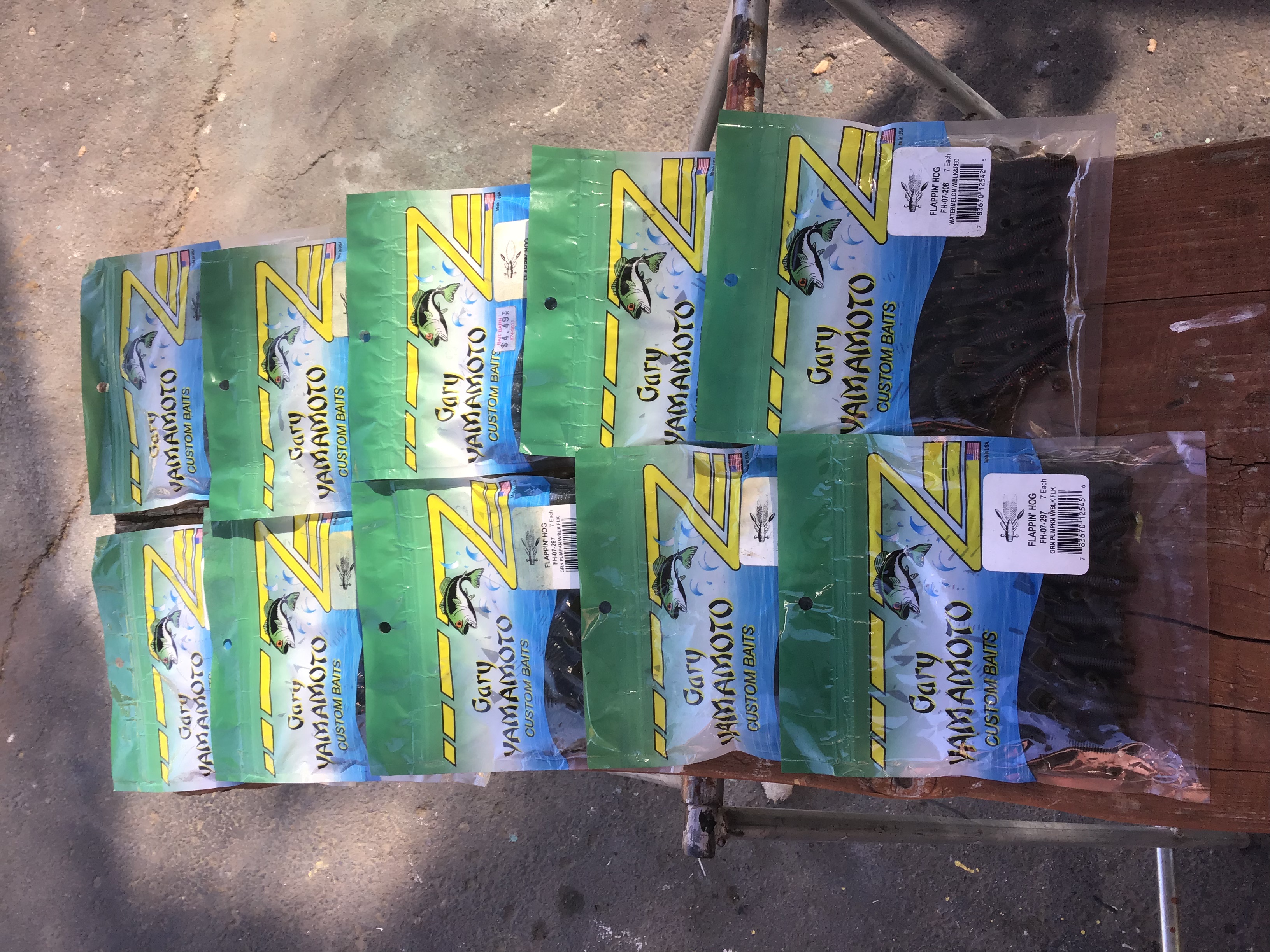 I have “10” packs of new flappin hogs. You get “5” packs watermelon w/black&red flake #FH-07-208, “4” packs green pumpkin w/black flake#FH-07-297, and “1” pack of smoke w/black,blue & gold flake#FH-07-214. $45 shipped PayPal only